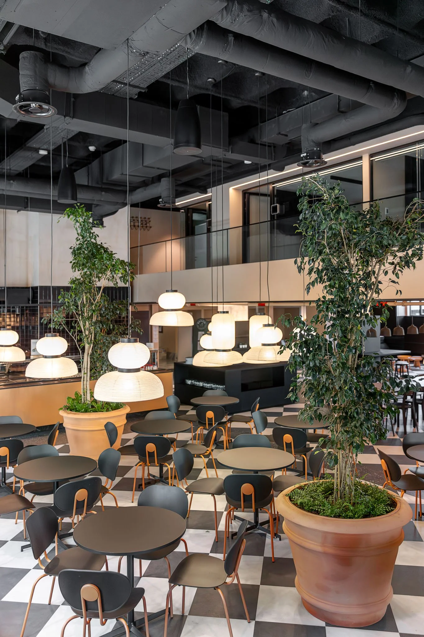 Distribuído por três pisos com mezzanines, o escritório inclui diversos ambientes de trabalho, salas de reunião, phone booths, copas e zonas lounge, todos adaptados às necessidades das diferentes equipas. A receção mantém a imponência original, com pé-direito generoso e pavimento em mármore, e dá acesso à cafeteria e ao auditório. A área de socialização assume-se como ponto central do dia a dia dos colaboradores, com pavimento em xadrez, tectos acústicos, grandes janelas, carpintarias em madeira e sofás circulares.