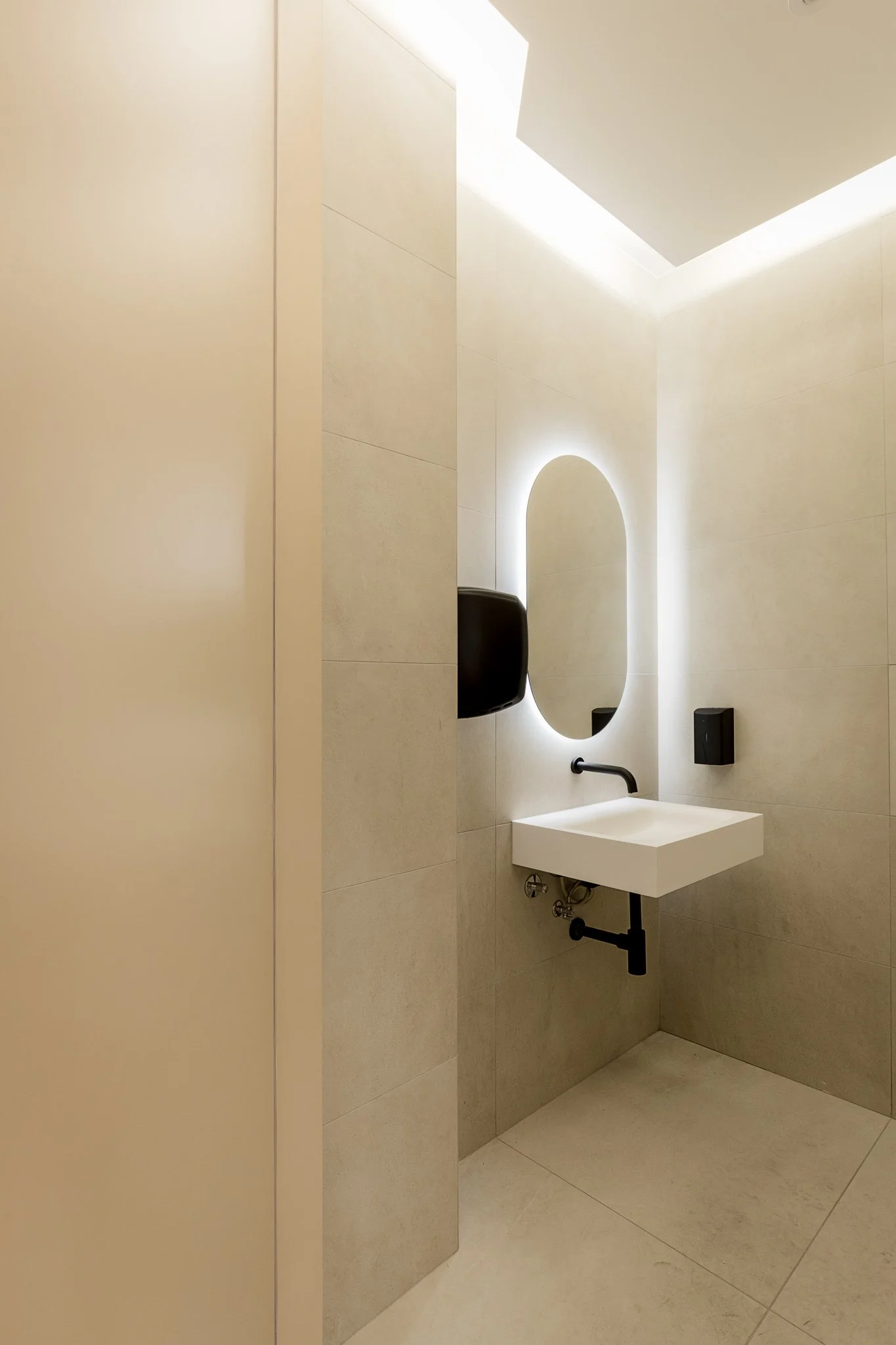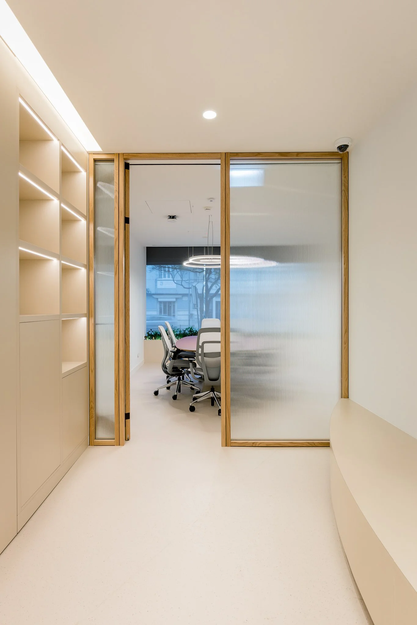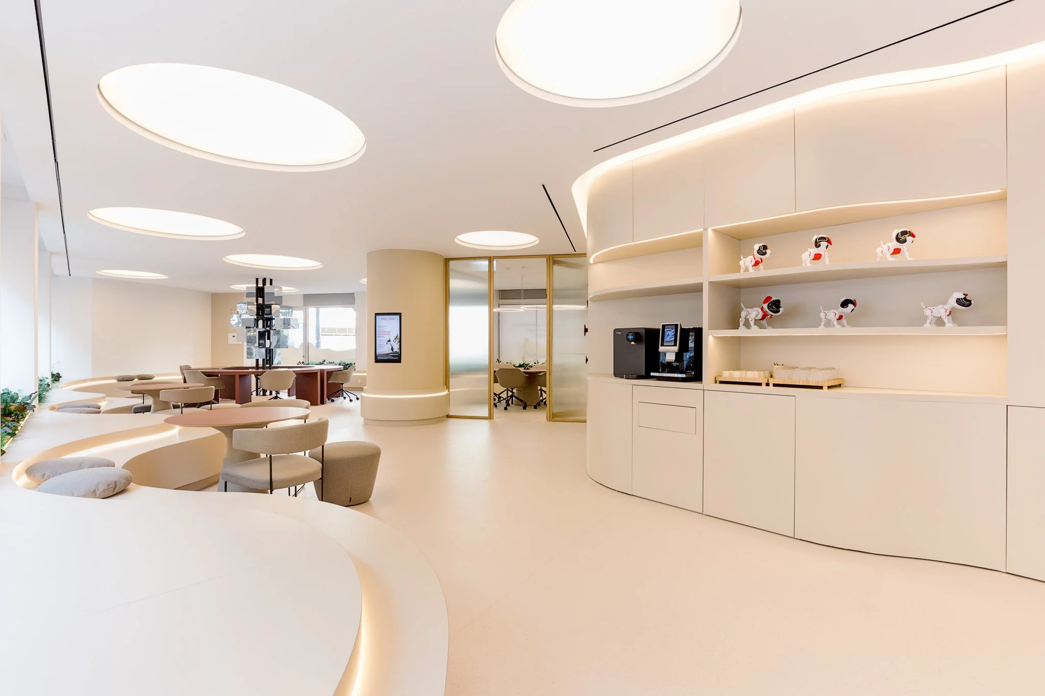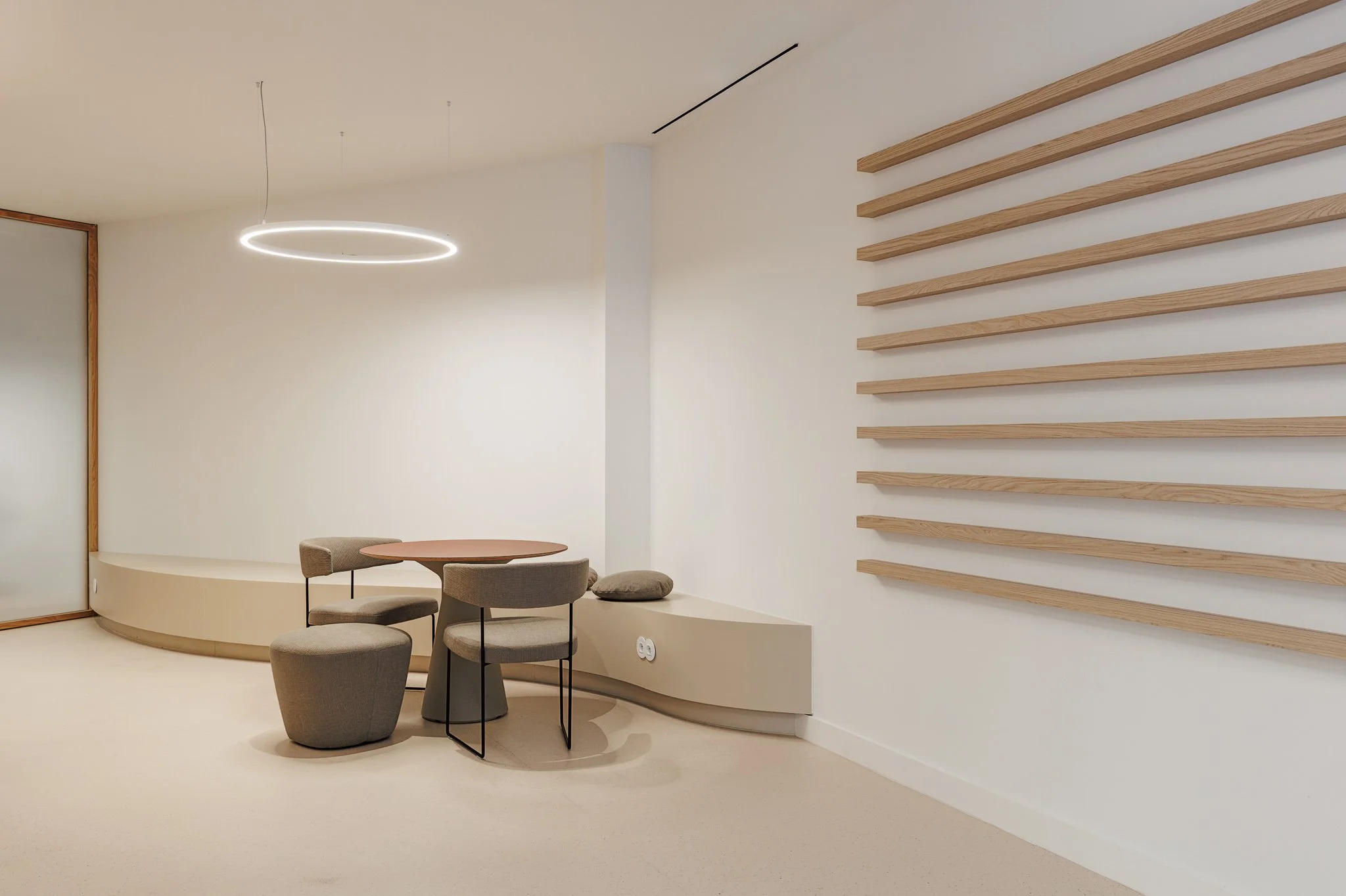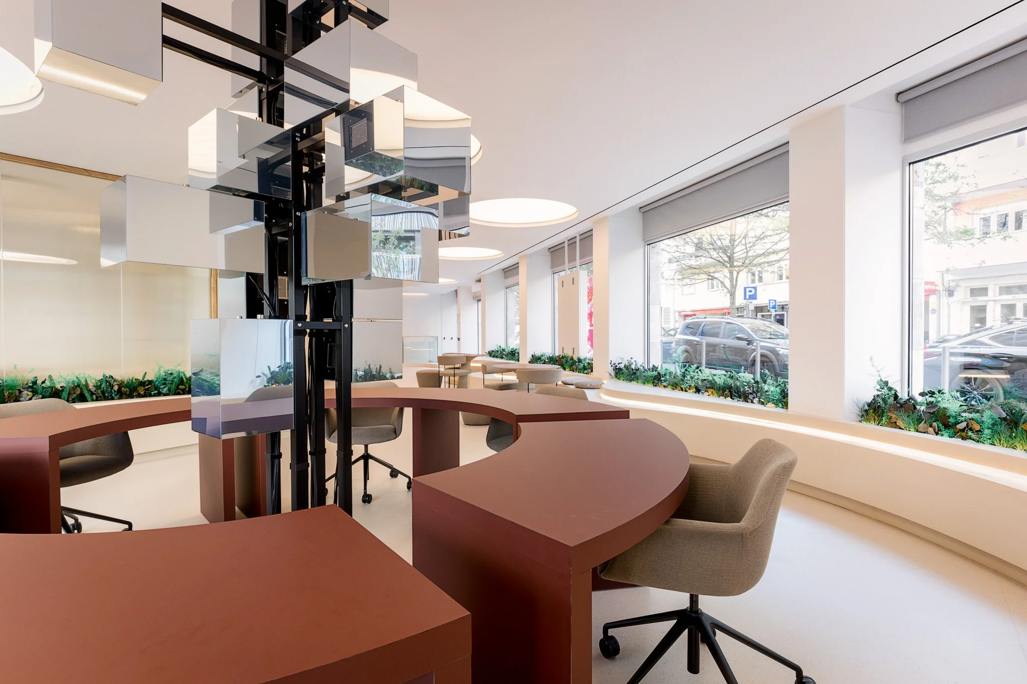 No piso térreo, a intervenção centrou-se na criação de um ambiente fluido, luminoso e intuitivo, pensado para acolher e guiar o utilizador ao longo de toda a sua jornada. Destaca-se a zona de atendimento, marcada por carpintarias desenhadas à medida e bancos corridos ondulados que introduzem dinamismo e conforto ao espaço. A área de trabalho circular assume-se como elemento central, reforçada por uma escultura espelhada que amplifica a perceção espacial e contribui para uma experiência mais imersiva. As salas de reuniões, delimitadas por divisórias em madeira, garantem privacidade sem comprometer a transparência e a continuidade visual do conjunto.