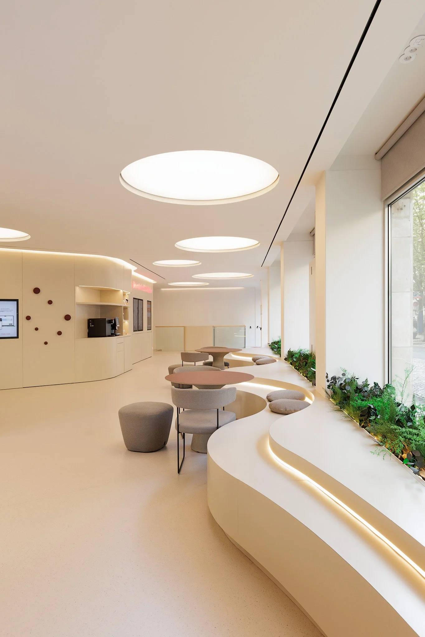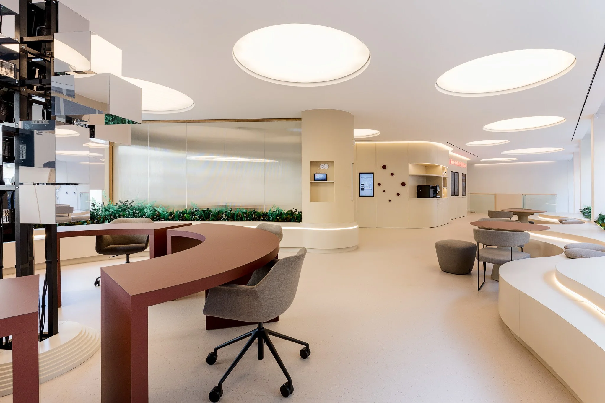 A sua abordagem integrou não só preocupações estéticas e arquitetónicas, mas também os valores centrais do projeto, como a sustentabilidade, o bem-estar e a criação de uma experiência verdadeiramente centrada no cliente e na comunidade. Com este foco na sustentabilidade, houve um claro cuidado na escolha de materiais, na organização dos espaços e na criação de ambientes que equilibram a vertente digital com a proximidade humana.