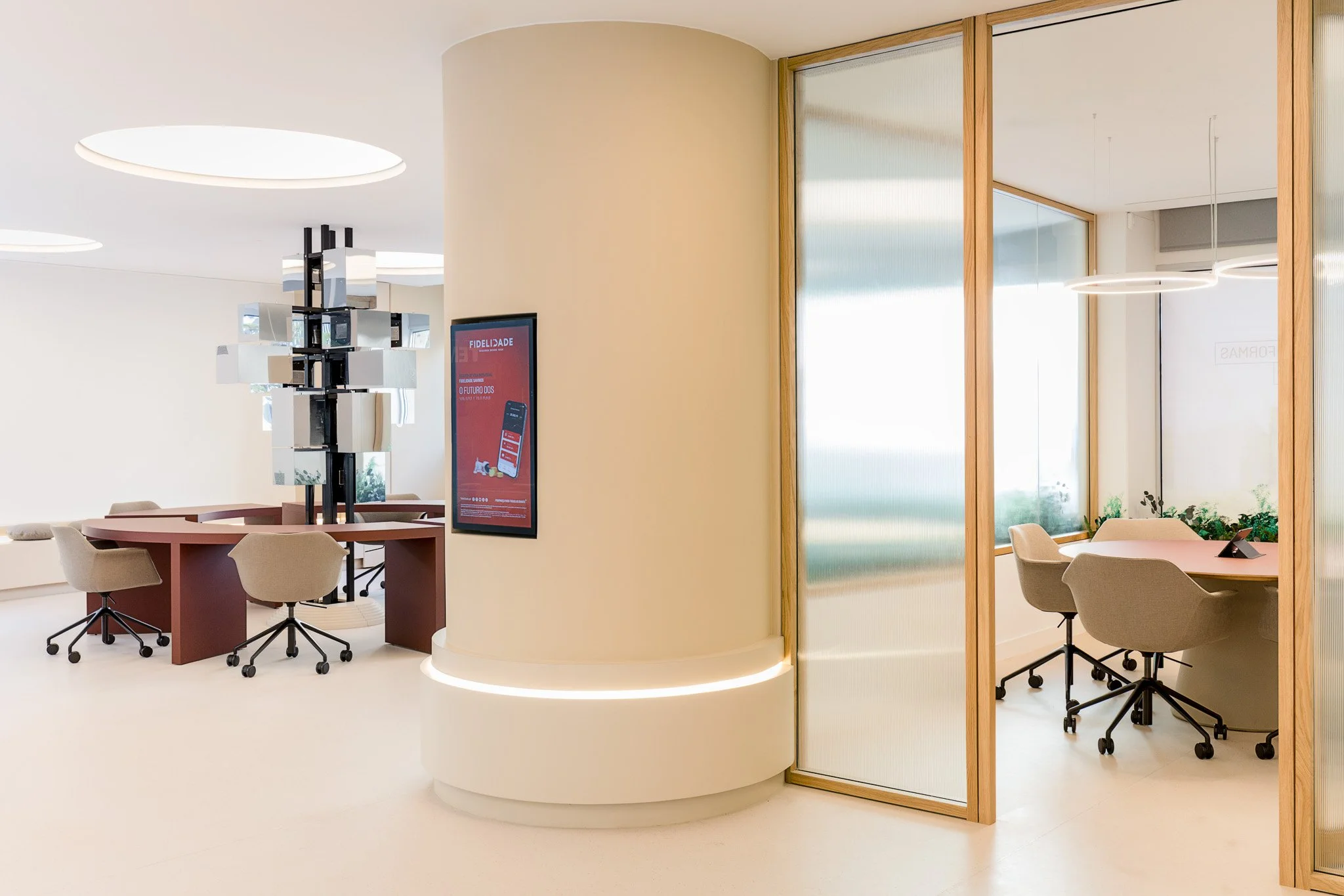 O resultado é um espaço que vai além do modelo tradicional de agência, traduzindo-se numa plataforma física e tecnológica onde arquitetura, construção e experiência se alinham para refletir os valores da Fidelidade e responder às novas expectativas dos utilizadores.