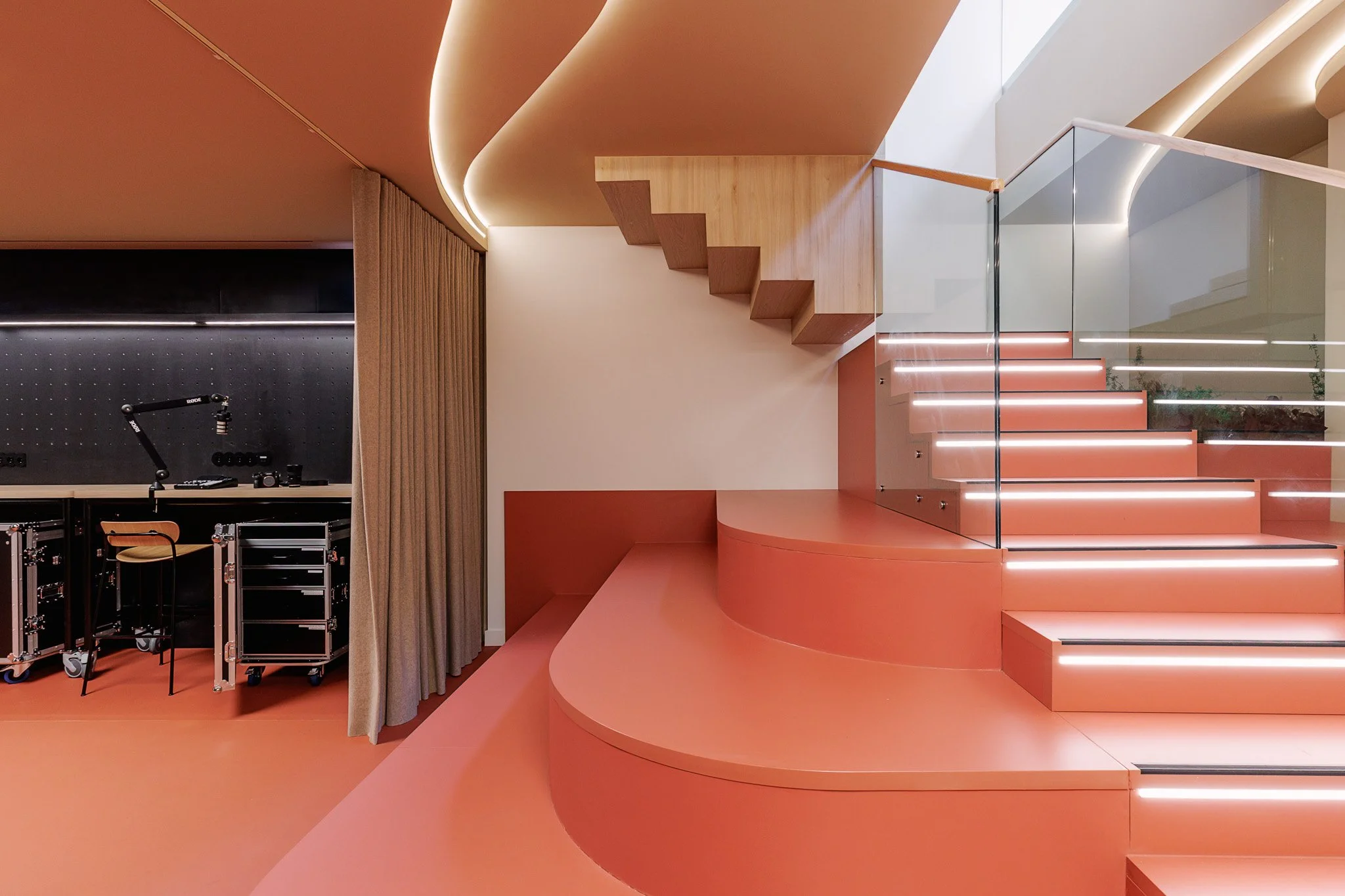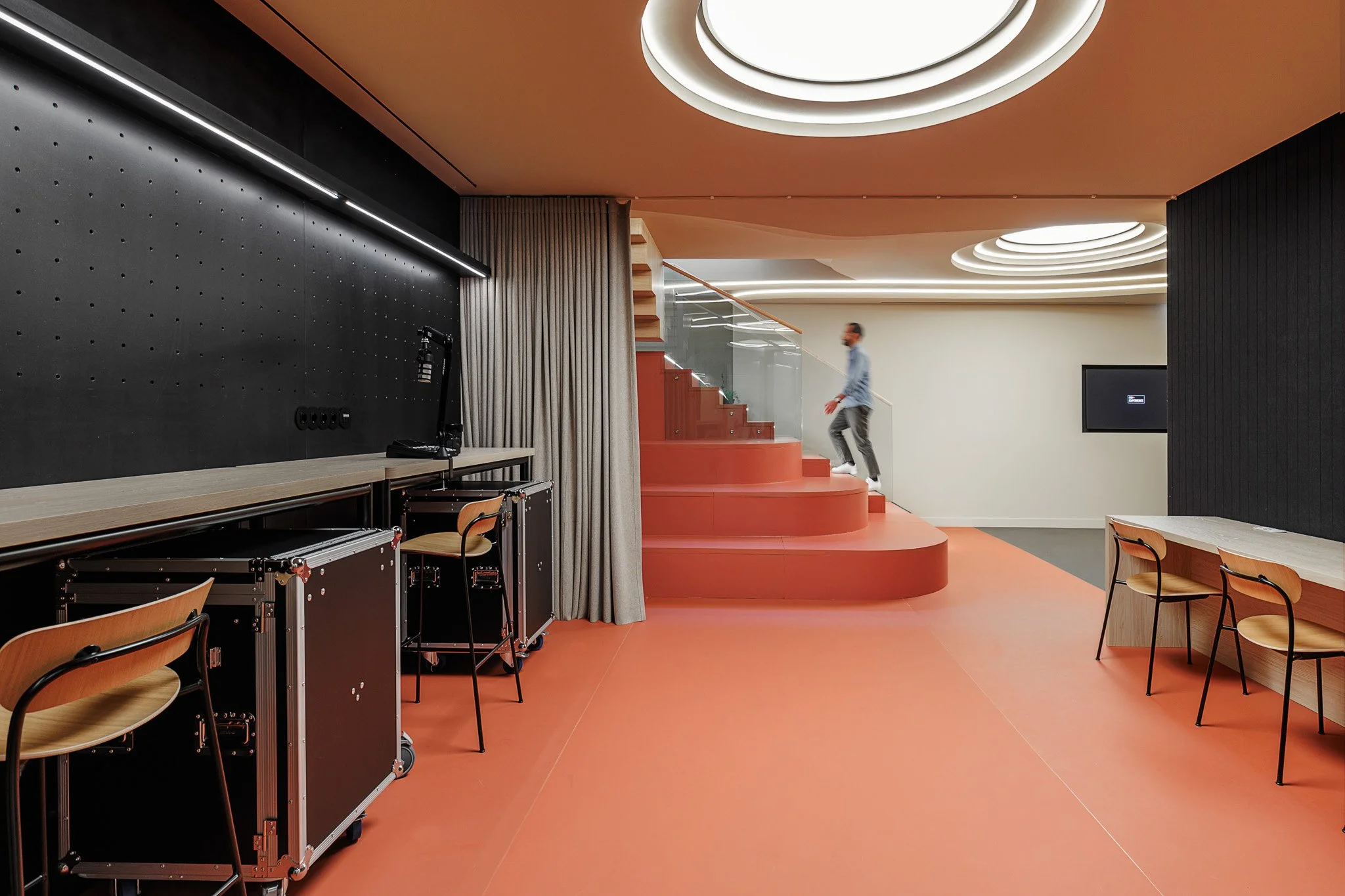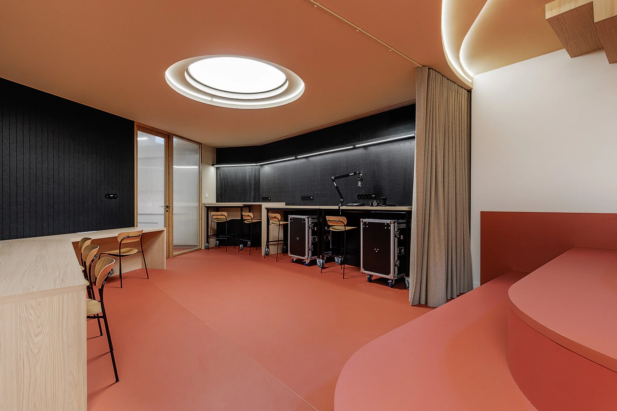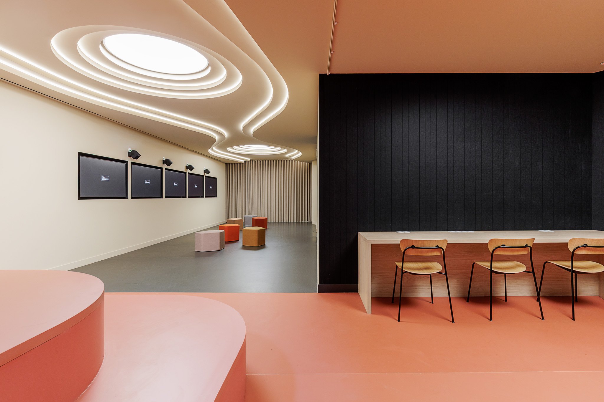 No piso subterrâneo, concebido como uma extensão versátil da agência, a Vector Mais deu forma a um espaço dedicado a eventos, conteúdos e interação. Organizado em quatro ambientes distintos — um auditório de pequena escala, uma sala multifuncional, uma área equipada para trabalho e gravação de podcasts e uma cozinha de apoio — este piso reforça a dimensão experiencial e comunitária da FidExperience, permitindo acolher iniciativas diversas com forte componente digital e participativa.