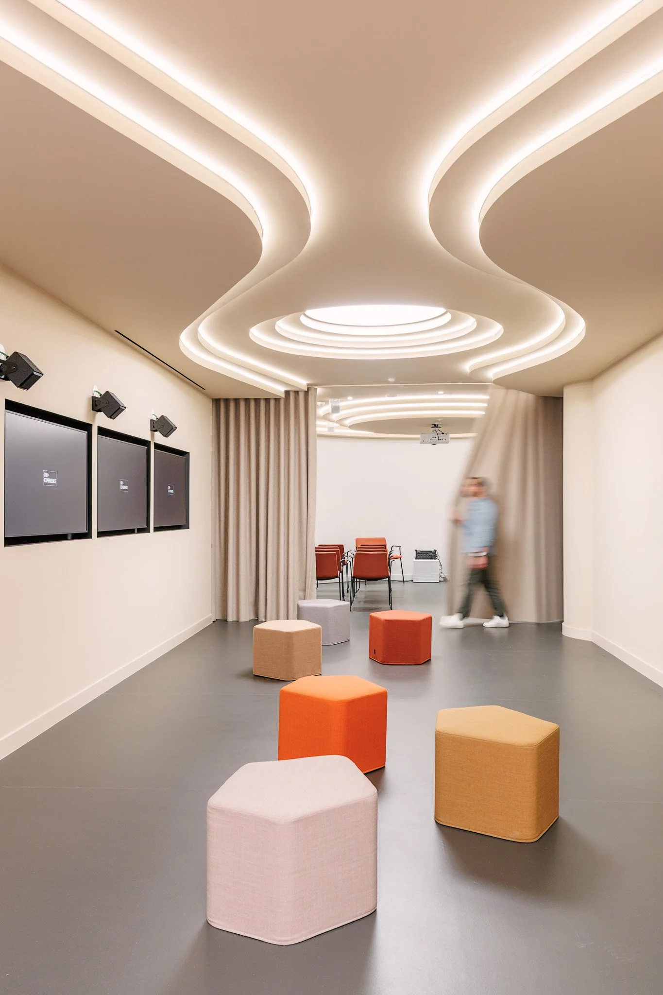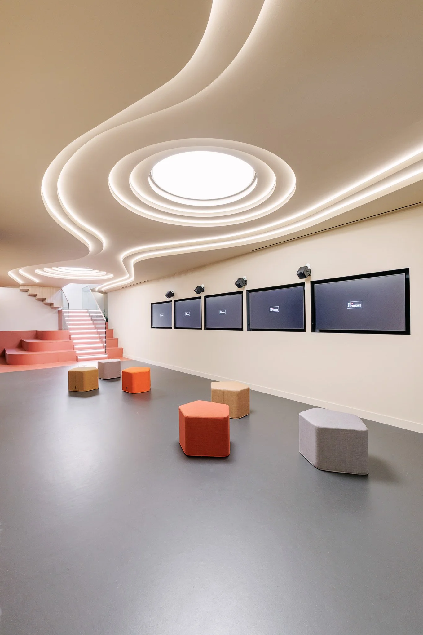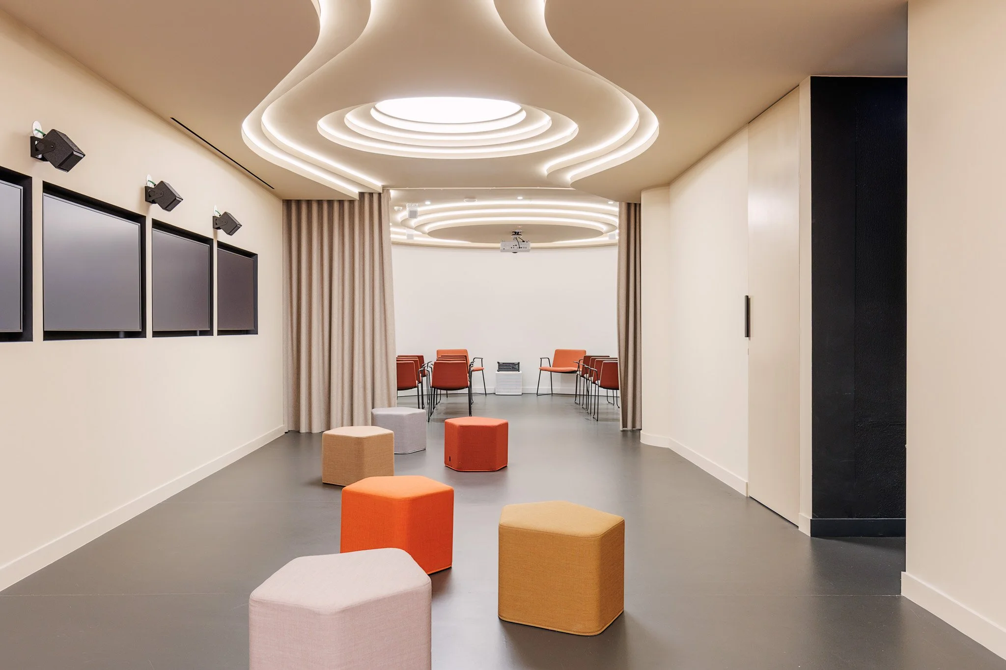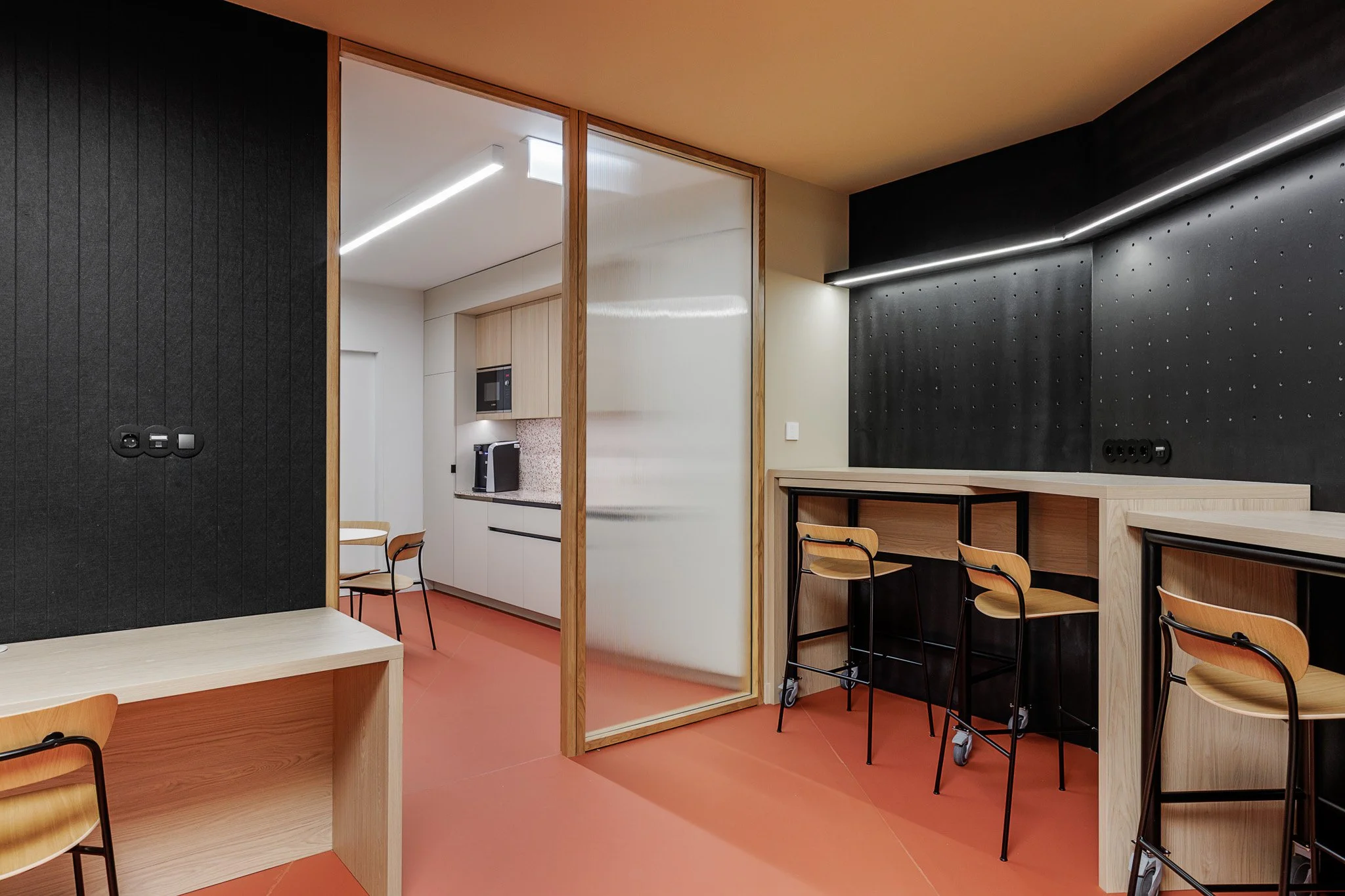 No piso subterrâneo, concebido como uma extensão versátil da agência, a Vector Mais deu forma a um espaço dedicado a eventos, conteúdos e interação. Organizado em quatro ambientes distintos — um auditório de pequena escala, uma sala multifuncional, uma área equipada para trabalho e gravação de podcasts e uma cozinha de apoio — este piso reforça a dimensão experiencial e comunitária da FidExperience, permitindo acolher iniciativas diversas com forte componente digital e participativa.