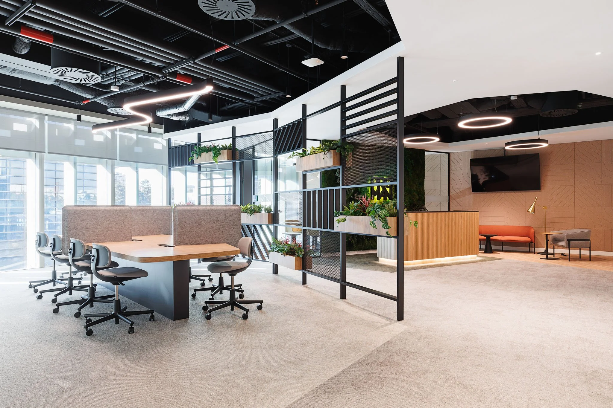 A recepção, sem dúvida, com o seu grande jardim vertical com o logotipo da Proman, que convida à entrada e recebe os colaboradores e visitantes. Ainda neste espaço, a área de hot desking, com as estantes/biombo metálicas feitas à medida, vegetação e elementos decorativos, que concedem privacidade aos postos de trabalho volantes para colaboradores e visitantes externos. Destaco igualmente a cafetaria, espaço de excelência para a socialização, com um ambiente de cor variante do verde corporativo e mobiliário confortável, que permitem aos colaboradores fazer uma pausa ou tomar uma refeição, numa área descontraída, serena e informal. Também o executive lounge e a grande sala de reunião de 26 lugares, revestida a painéis de madeira fresados e a imponente mesa de carvalho de 7.8 metros, feita por medida pela Bamer.